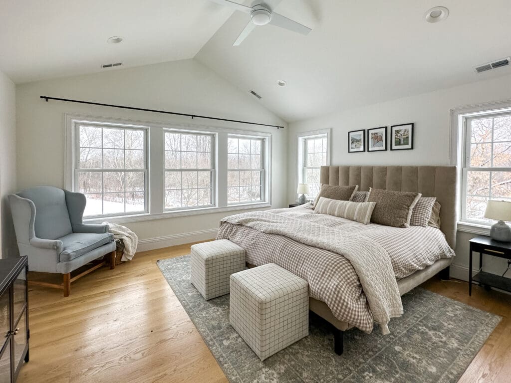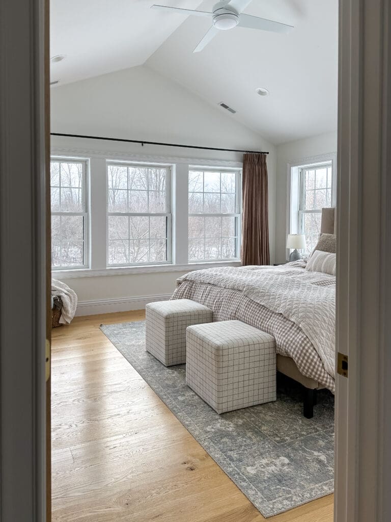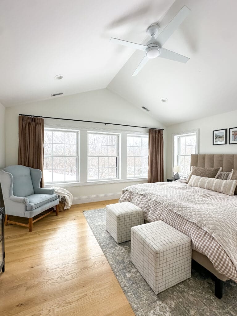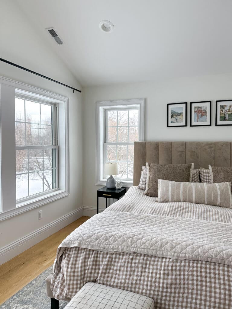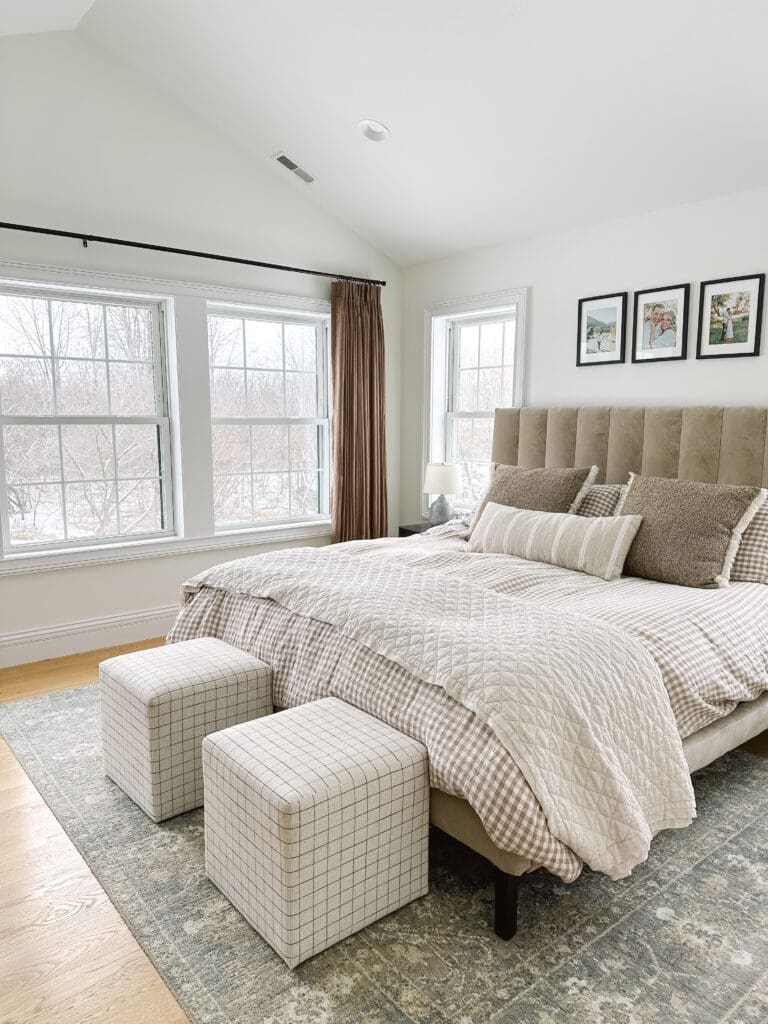 If you peek at the before photos, the room felt spacious and light, but also a bit sparse in the winter months when the leaves have fallen and everything outside is as white as the inside. Adding drapery completely transformed the space. The chocolate-brown cloud cotton fabric instantly added depth and warmth, grounding the room without making it feel heavy. It’s that perfect blend of cozy and sophisticated. It’s soft enough to feel inviting, but structured enough to look intentional and polished.